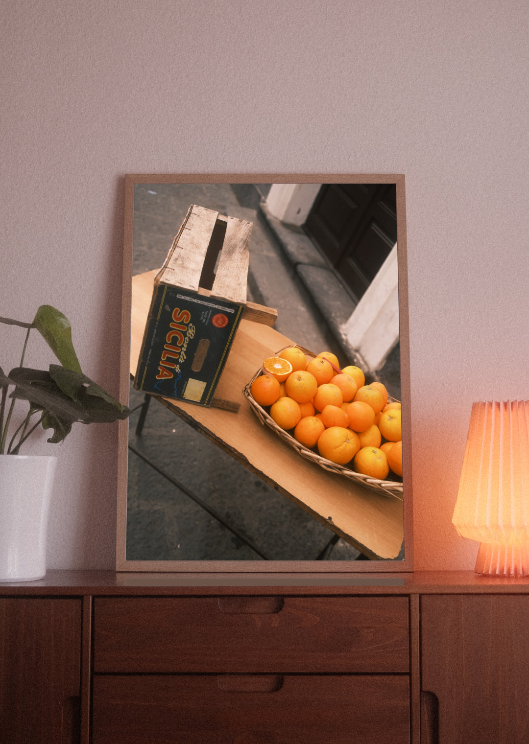 Die pure Essenz des Südens. Die spritzige Frische der sizilianischen Orangen, ein einfacher Genuss unter der Sonne – all das bringt dir dieses Poster nach Hause.
