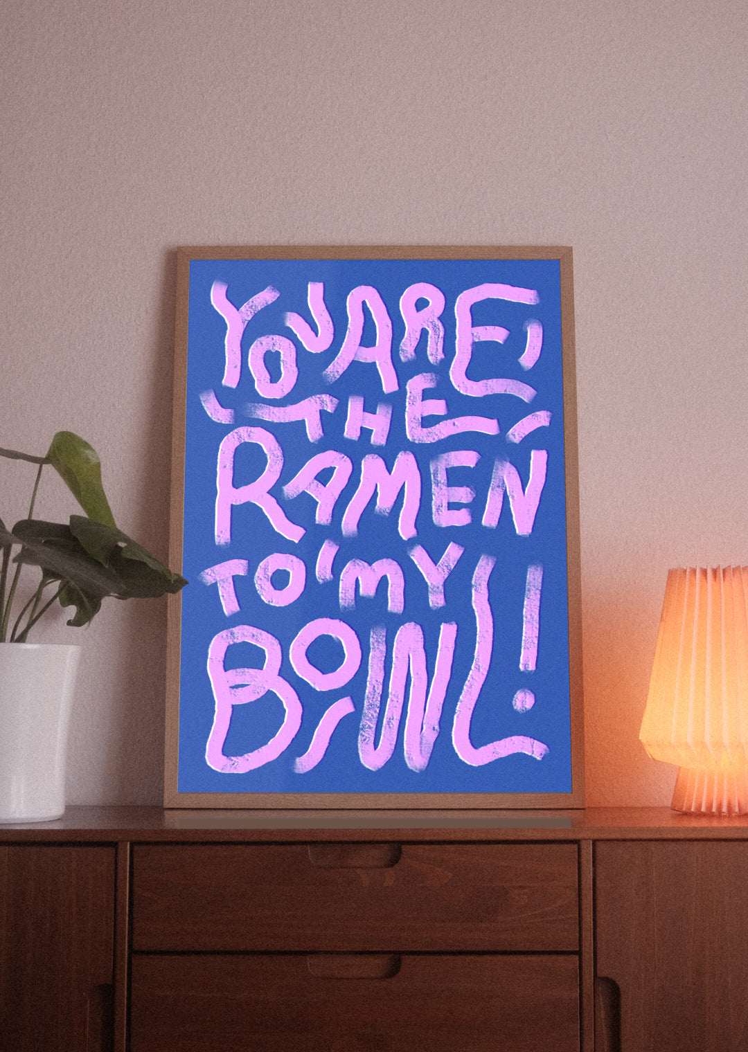 Manche Dinge gehören einfach zusammen – wie die perfekte Liebe und eine Schüssel Ramen. Dieses Poster ist die lustige Hommage an eine ganz besondere Partnerschaft.